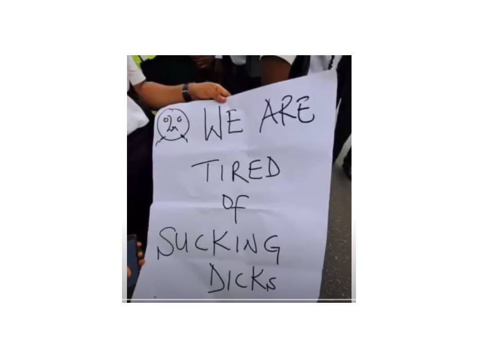 The students carried placards with inscriptions: “Professor Ndifon let the girls with big breasts breathe stop suffocating us”, “Enough of law school list manipulation”, and “Professor Ndifon must go for our sanity”.